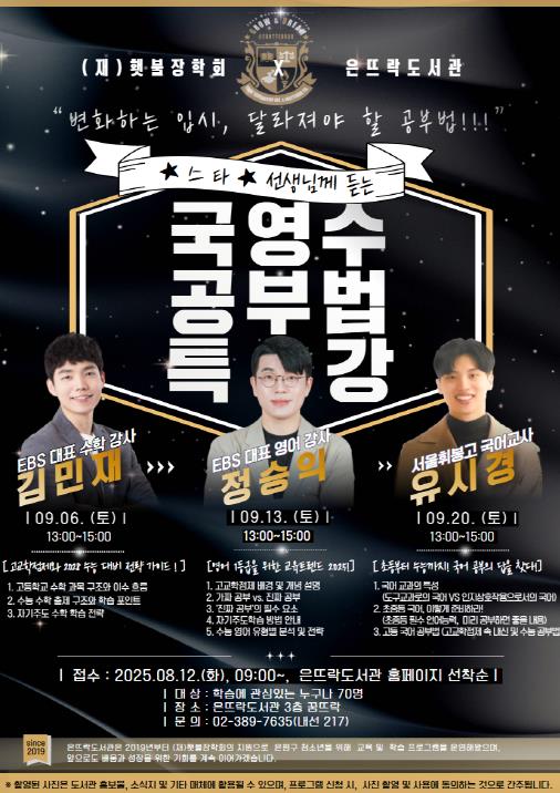 이번 특강은 오는 9월 6일부터 20일까지 매주 토요일 오후 1시부터 3시까지 은뜨락도서관에서 총 3회에 걸쳐 진행된다. 과목별 강연은 ▲수학은 9월 6일, 김민재 EBS 강사 ▲영어는 9월 13일, 정승익 EBS 강사 ▲국어는 9월 20일, 유시경 서울 휘봉고 교사가 진행한다.