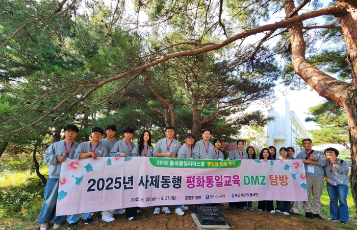 ![]() ‘사제동행 평화통일 DMZ탐방’에 참가한 학생들이 기념사진을 찍고 있다. |