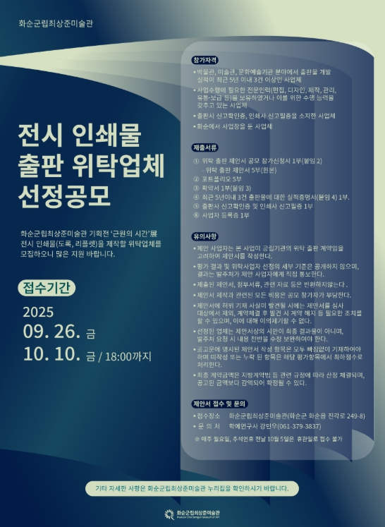![]() 화순군립최상준미술관 전시 인쇄물 출판 위탁 업체 선정 공모 포스터 |
