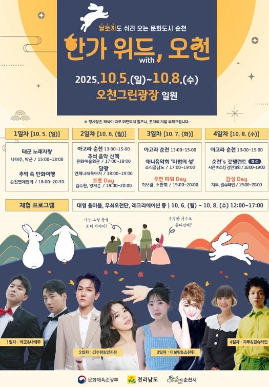 시 관계자는 “이번 추석맞이 문화콘텐츠 축제를 통해 순천이 문화도시로서 지닌 문화적 역량과 예술적 잠재력을 시민과 관광객 모두가 느낄 수 있기를 바란다”고 말했다.