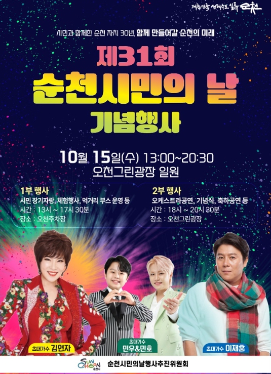 제31회 순천시민의 날 축하 공연 피날레로 쿨 이재훈, 레전드 가수 김연자, 트로트계 신동으로 떠오르고 있는 황민호, 그의 형이자 리틀싸이 민우 가수가 출연, 다양한 축하 공연이 진행되고 28만 순천시민이 함께 즐기는 화려한 불꽃쇼가 가을 밤하늘을 수놓으며 시민들에게 감동의 순간을 선사할 계획이다. 개인 돗자리를 지참하면 더 편안하게 관람할 수 있다.
