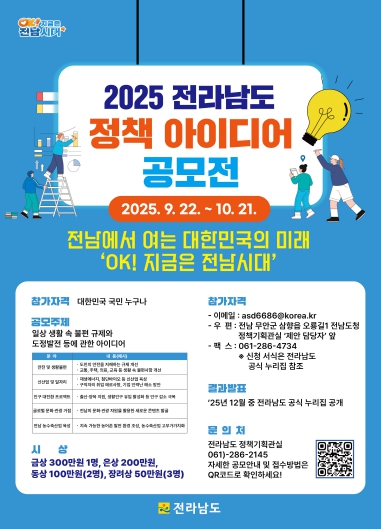 조대정 전남도 정책기획관은 “좋은 정책 1개는 국민 모두에게 힘이 될 5천200만 개의 정책과 다름없다”며 “행정의 수요자인 국민에게서 나온 창의적 아이디어가 정책으로 발전하도록 많은 국민이 참여하길 바란다”고 당부했다.
