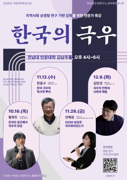 한편, ‘한국의 극우’ 연속 강연은 2025년 국립대학 육성사업의 일환으로 전남대학교 5·18연구소와 광주청년유니온이 공동 주최한다.