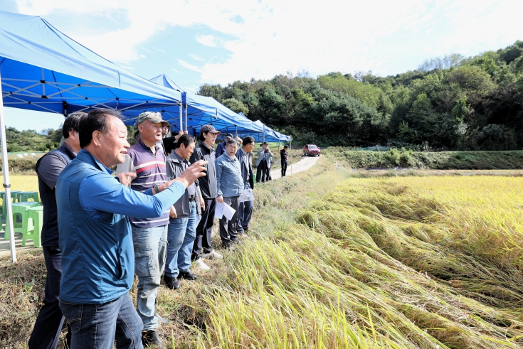 황인홍 무주군수를 비롯한 6개 읍·면 이장, 그리고 지역 내 벼 재배농가 등 60여 명이 참석해 ‘신동진1’의 주요 특성과 전시포 운영 현황을 공유하고 생육 상황을 직접 점검했다.