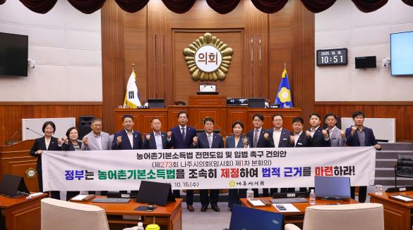 ![]() 나주시의회, ‘농어촌기본소득법 전면도입 및 입법 촉구 건의안’ 채택 |