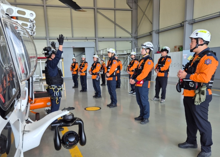이번 훈련은 지난 15일 도내 소방서 구급대원 13명이 참여한 가운데 진행됐다. 훈련 과정에서는 ▲응급의료서비스 소방헬기 운용 절차 ▲현장-헬기 간 환자 인계 방법 ▲산악·수난사고 시 항공구조 절차 등을 집중적으로 다뤘다. 구급대원들은 실제 산악사고 현장을 가정해 들것 고정, 헬기 착륙지점 확보, 환자 인계 절차를 반복 숙달하며 실전 대응능력을 높였다.