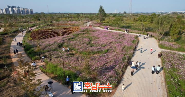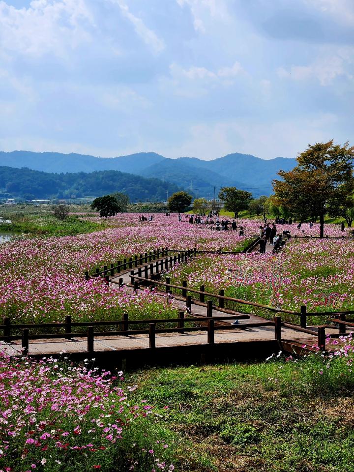 Yeongsangang Garden in Naju is adorned with large-scale cosmos flower paths in shades of pink, yellow, and more. Photo zones are placed along the paths, making it a perfect spot to capture memories.