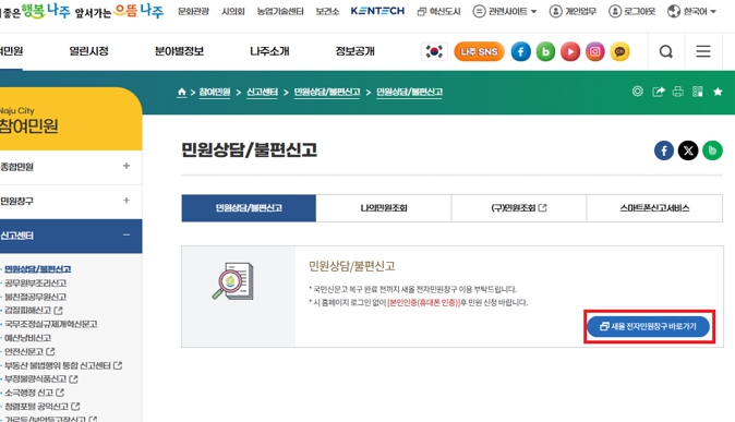 나주시(시장 윤병태)는 지난 9월 26일 발생한 국가정보자원관리원 화재 이후 국민신문고와 안전신문고 기능이 일시 중단됨에 따라 시청 누리집에 ‘새올 전자민원창구’ 임시 페이지를 개설해 일반 민원을 접수하고 있다고 16일 밝혔다.