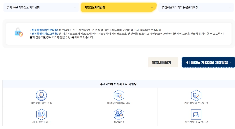 이를 통해 도교육청 누리집 내 개인정보 처리방침 및 관련 안내 전체를 음성으로 들을 수 있으며, 사용자가 ‘읽어보기’ 버튼을 누르면 자동으로 음성이 재생된다.