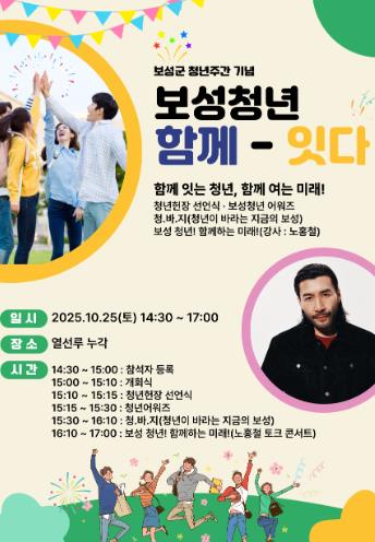 ‘보성 청년 함께-잇다’ 프로그램에서는 김철우 보성군수와 지역 청년이 소통하는 ‘청바지(청년이 바라는 지금의 보성)’, 청년들의 성취를 격려하는 ‘청년어워즈’, 방송인 노홍철과 함께하는 ‘토크콘서트’가 마련된다.
