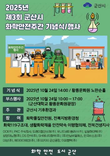 김현숙 군산시 기후환경과장은 “이번 제3회 군산시 화학안전주간이 화학물질의 위험성과 시에서 추진하고 있는 화학안전 사업 등 각 기관의 역할을 시민들이 이해하는 계기가 되길 바란다.”라며 시민 여러분의 많은 관심과 참여를 당부했다.