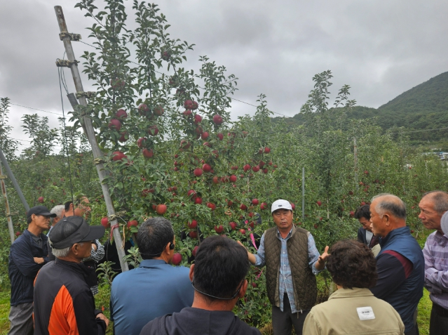 이번 견학은 곡성군 사과 재배농업인 30명이 참석한 가운데, 사과 다축 재배 기술과 과원 관리 기법을 현장에서 직접 보고 배우는 실질적인 교육의 장으로 마련됐다.
