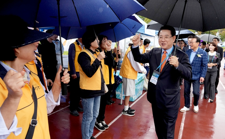 ![]() 김영록 전라남도지사가 18일 광주광역시 상무시민공원에서 열린 ‘재광완도군향우회 제13회 한마음체육대회’ 행사에서 향우회원들을 격려하고 있다. |