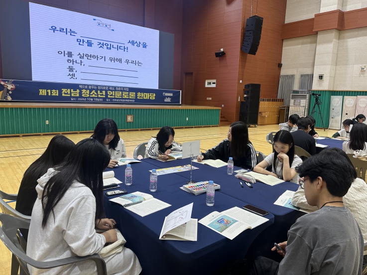 ‘책으로 꿈꾸는 정의로운 세상, 청춘의 외침’을 주제로 열린 이번 한마당에는 도내 중학교 3학년과 고등학교 1학년 학생 75명이 참여해, 책을 매개로 삶과 사회를 성찰하는 깊이 있는 토론을 펼쳤다.