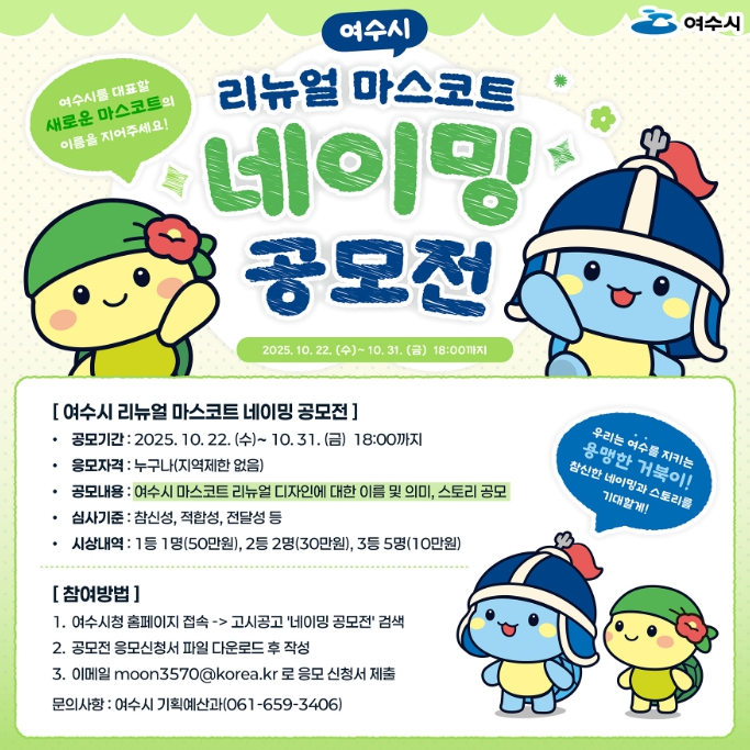 이번 공모전은 지난 9월 실시한 대국민 선호도 조사 결과를 바탕으로 최종 보완·발전된 마스코트 디자인을 시민에게 공개하고 새로운 여수시 마스코트에 어울리는 이름과 이야기를 선정하기 위해 마련됐다.