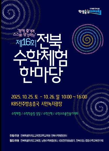 유정기 교육감권한대행은 “전북수학체험한마당은 교과서의 틀을 넘어 놀이, 게임, 미술, AI 활용 등 다양한 영역에서 체험을 통해 수학의 원리를 이해하고 탐구하며 학생들이 수학학습에 자신감을 얻는 의미 있는 수학교육 확산의 장이 될 것”이라며 “학생의 흥미와 창의성을 자극하는 체험중심의 수학체험한마당에 많은 학부모와 학생이 참여해 수학의 즐거움을 느낄 수 있길 바란다”고 말했다.