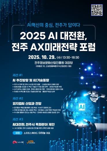 전주시와 (재)전주정보문화산업진흥원(원장 허전, 이하 진흥원)은 오는 29일 진흥원 대강당에서 ‘AI혁신의 중심, 전주가 답이다’를 주제로 한 전주AX미래전략 포럼을 개최한다.