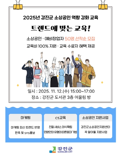 이번 교육은 개인(소상공인 및 예비창업자)과 단체(상인회 및 예비 상인회)로 나눠 접수받으며, 총 50명을 선착순 모집한다. 개인은 신청서와 개인정보 제공 동의서를, 단체는 단체용 신청서를 작성해 11월 7일까지 강진군청 지역경제연결팀에 직접 제출하거나 강진군 누리집 소상공인지원센터를 통해 온라인으로 신청하면 된다.