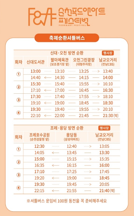 셔틀버스의 승하차 장소는 남교오거리이며, 운행 노선과 시간표 및 이벤트 내용은 순천푸드앤아트페스티벌 홈페이지와 순천 관광 공식 SNS를 통해 안내될 예정이다.