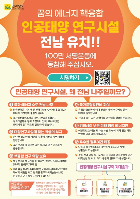 ![]() 나주시가 인공태양 연구시설 유치를 위해 시민 서명운동을 진행하고 있다. 사진은 인공태양 연구시설 전남 나주 유치 서명운동 포스터. |