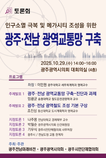 이번 토론회는 광주·전남 광역교통망 통합 전략이 지방소멸 극복과 서남권 메가시티 실현의 출발점이 될지 주목된다.