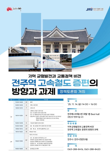 시와 전주시정연구원은 오는 11월 14일 오후 2시, 베스트웨스턴플러스 전주호텔 1층 베스트홀(완산구 현무1길 41)에서 ‘지역 균형발전과 교통정책 비전-전주역 고속철도 증편 방향과 과제’를 주제로 정책토론회를 개최한다.