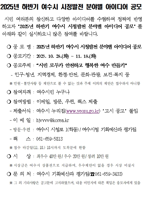 ![]() ‘2025년 하반기 여수시 시정발전 분야별 아이디어 공모’ 공고문 |