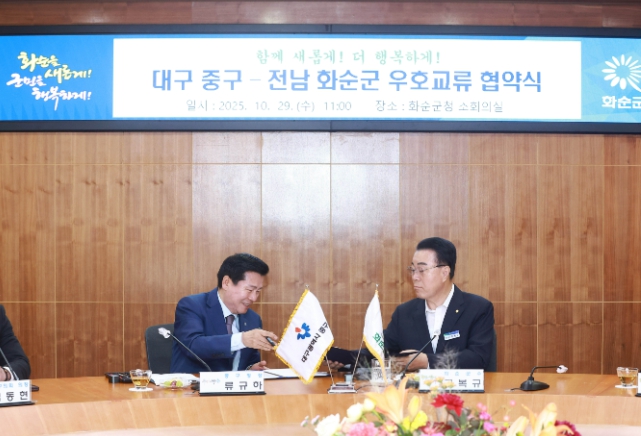우호교류 협약을 기념해 화순군은 지역 대표 특산품인 샤인머스켓과 불미나리즙을, 대구 중구는 국가 무형유산인 단청장 보유자가 제작한 단청 공예품과 약령시에서 생산한 약령황제단을 선물했다.
