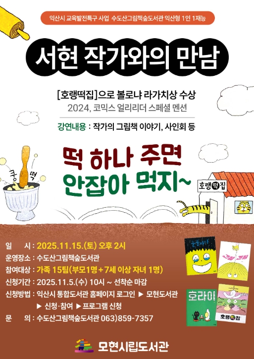익산시는 수도산그림책숲도서관에서 오는 11월 15일 교육발전특구사업의 일환으로 '서현 작가와의 만남' 강연 프로그램을 운영한다고 31일 밝혔다.