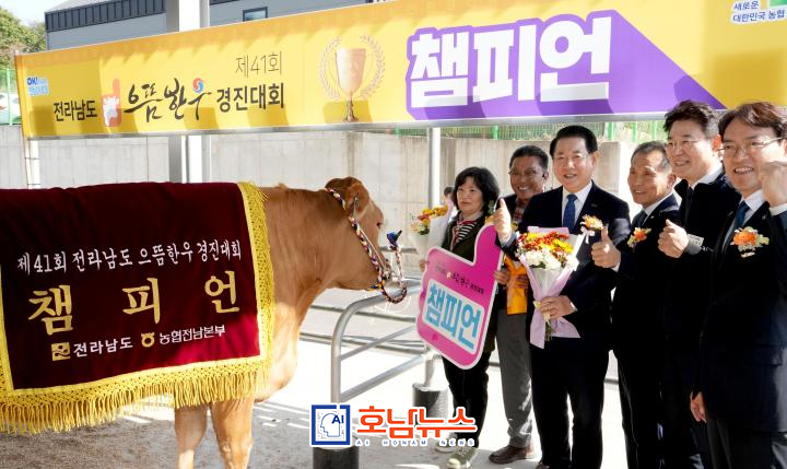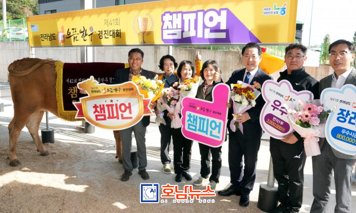 전라남도가 6일 개최한 ‘제41회 전라남도 으뜸한우 경진대회’에서 보성군 조정화 농가가 영예의 종합챔피언을 차지했다. 또 고급육 부문 대상에는 광양시 서병근 농가가 선정되는 등 도내 한우농가 23곳이 우수성과를 거뒀다.