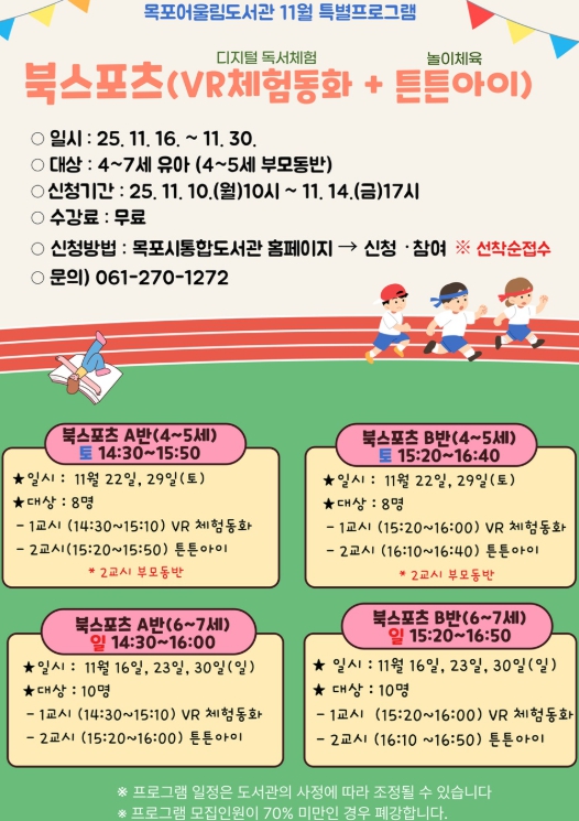 참여 신청은 오는 11월 10일부터 14일까지 목포시통합도서관 누리집을 통해 4세부터 7세까지의 유아를 대상으로 무료로 접수받는다.
