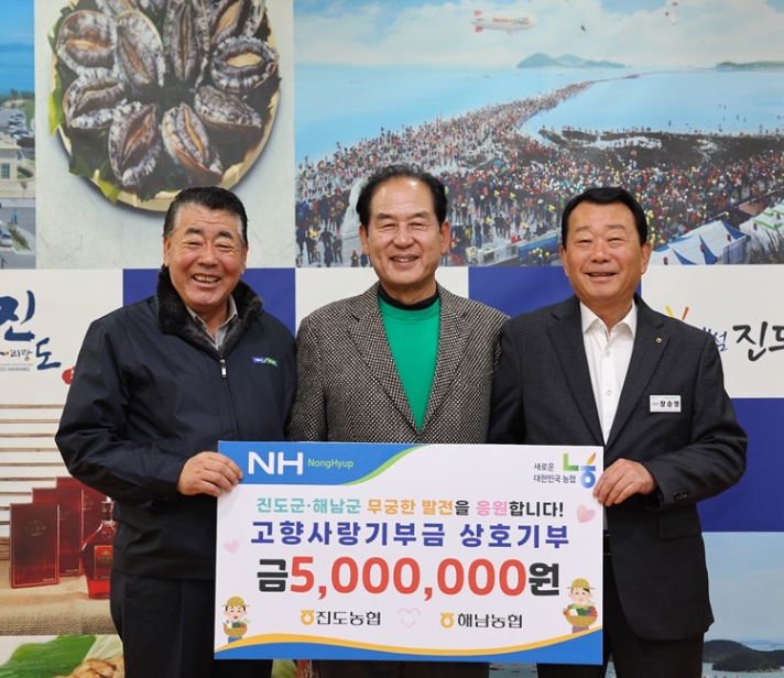 진도농협은 지난 해남미남축제에서 해남군에 고향사랑기부금 500만 원을 기부했으며, 이번에는 해남농협이 진도군에 고향사랑기부금 500만 원을 전달하며 서로를 응원하는 따뜻한 마음과 지역 상생의 의미를 나눴다.