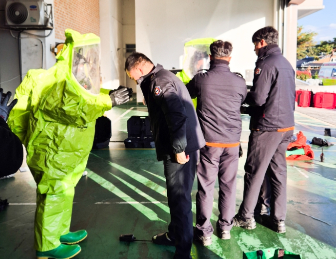 이어서 보건소 초동대응요원을 대상으로 개인 보호복(Level A)의 착·탈의 방법과 공기호흡기 사용법 등 실습 교육을 실시해 현장대응능력을 강화했다.
