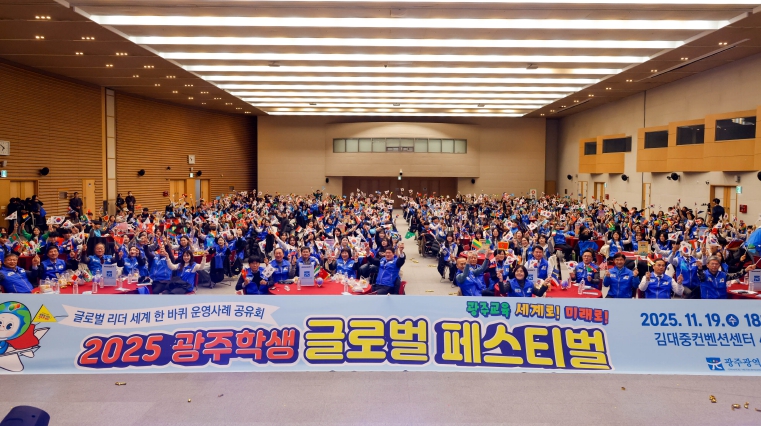 ![]() 광주시교육청이 20일 김대중컨벤션센터에서 진행한 ‘2025 광주학생 글로벌 리더 세계 한 바퀴 성과 나눔 페스티벌’에서 참여학생들이 관계자와 함께 기념사진을 촬영하고 있다. |