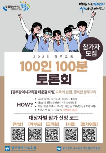 시교육청은 토론회에 앞서 오는 12월 5일까지 학생, 학부모, 교직원, 시민 등 주체별 25명씩 총 100명의 참가자를 선착순 모집한다.