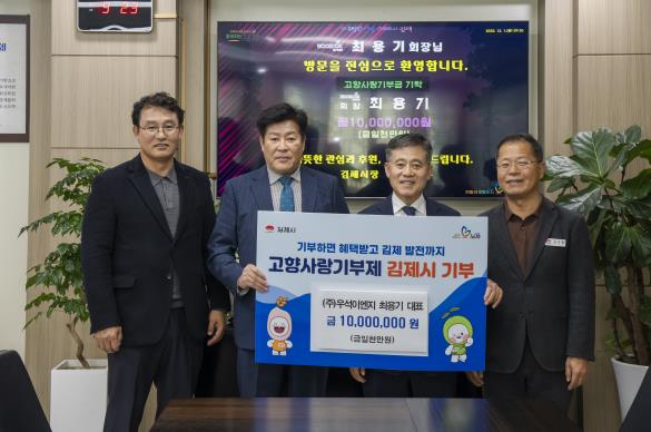![]() (주)우석이엔씨 최용기 회장, 김제시 고향사랑기부 ‘365일 24시간 아이돌봄센터 운영에’ 1,000만원 기탁 |