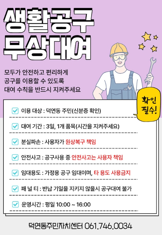 공구 대여 희망자는 신분증을 지참해 덕연동 행정복지센터 2층 주민자치센터를 방문해 1인 1개 품목을 최대 3일간 대여할 수 있다.