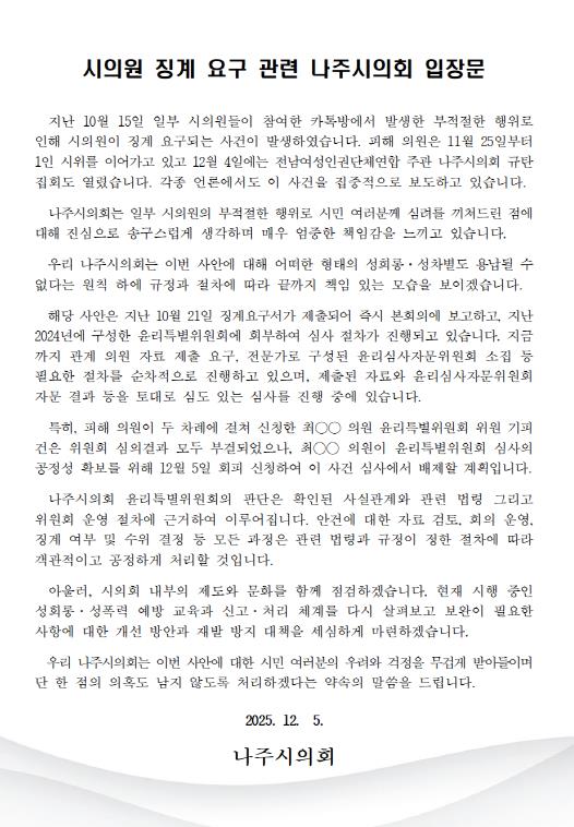 ![]() 나주시의회, 시의원 징계 요구 관련 입장문 발표 |