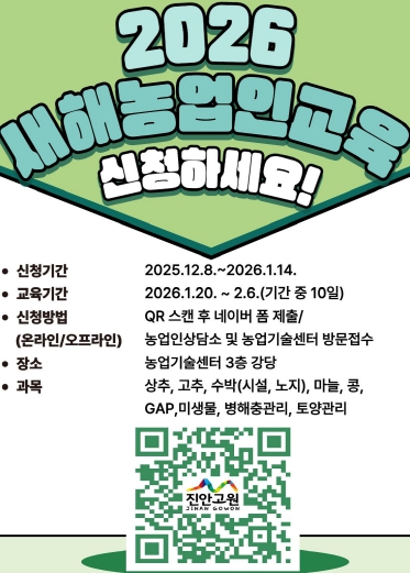 ![]() 진안군,2026 새해농업인 실용교육 교육생 모집(신청 포스터) |