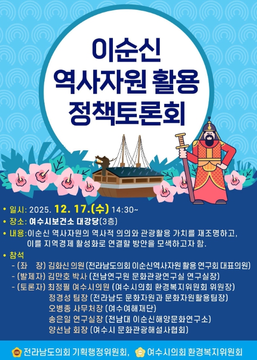이번 토론회는 최정필 여수시의회 환경복지위원장과 김화신 전남도의회 이순신역사자원 활용 연구회 대표의원이 공동 주관한다.