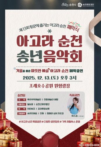 올해 폐막식은 한 해 동안 아고라 순천을 채워온 예술가와 시민의 노고에 감사하는 마음을 담아 송년음악회 형식으로 구성했으며, 누구나 편안하게 즐길 수 있는 다채로운 공연과 다양한 체험프로그램으로 진행될 예정이다.