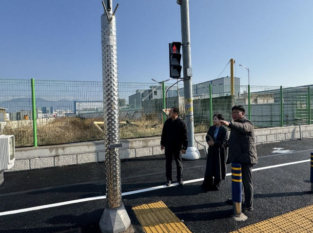 ![]() 계자들이 해룡·율촌산단 보행로 정비 완료 현장을 둘러 보고 있다. |