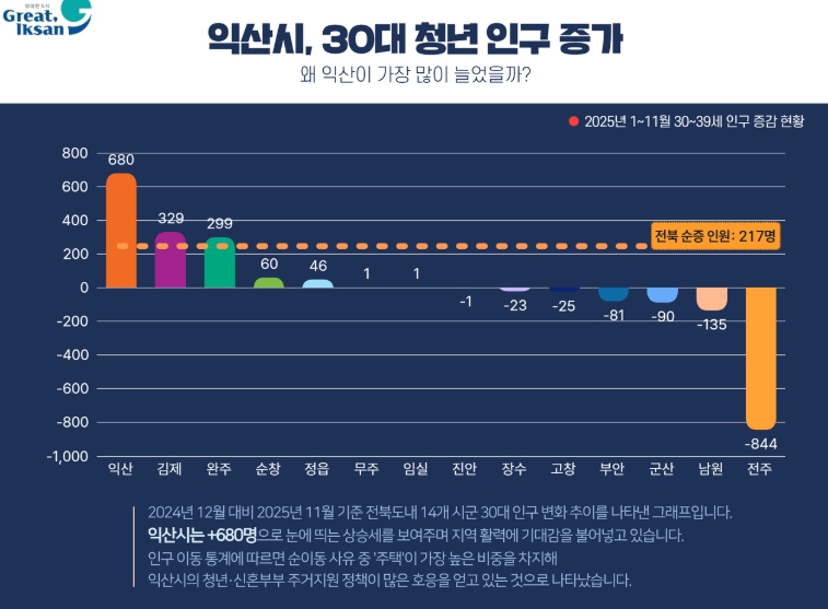 지난해 12월 대비 올해 11월 익산의 30대 인구는 680명 증가했다.