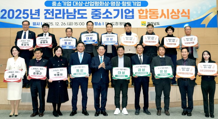 ![]() 김영록 전라남도지사가 26일 도청 왕인실에서 열린 2025년 중소기업 합동 시상식에서 전체 수상자들과 기념촬영을 하고 있다. |