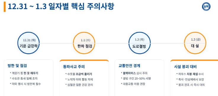 오택림 전북특별자치도 도민안전실장은 “전북자치도는 연말연시 대설과 한파 속에서도 도민과 방문객이 안전하게 해넘이와 해맞이를 즐길 수 있도록 모든 행정역량을 총동원하겠다”며 “도민 여러분도 따뜻한 옷차림과 행동요령 숙지로 사고 없이 새해를 맞이하길 바란다”고 말했다.