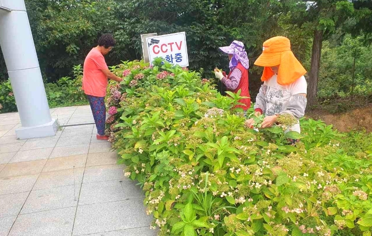 ![]() 나주시의 2025년 하반기 지역공동체일자리사업 참가자들이 동강면에 있는 영산강 한반도 지형 전망대 주변에 핀 수국을 가꾸고 있다. |