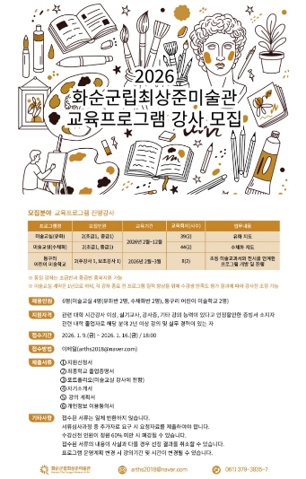 ![]() 화순군립최상준미술관 2026년 교육프로그램 강사모집 포스터 |