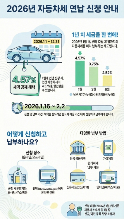 ![]() 영암군 자동차세 1월 연납으로 4.57% 세액공제 |