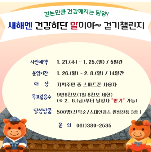 ![]() 담양군, 새해맞이 모바일 걷기 커뮤니티 ‘워크온(Walk ON)’ 운영 |
