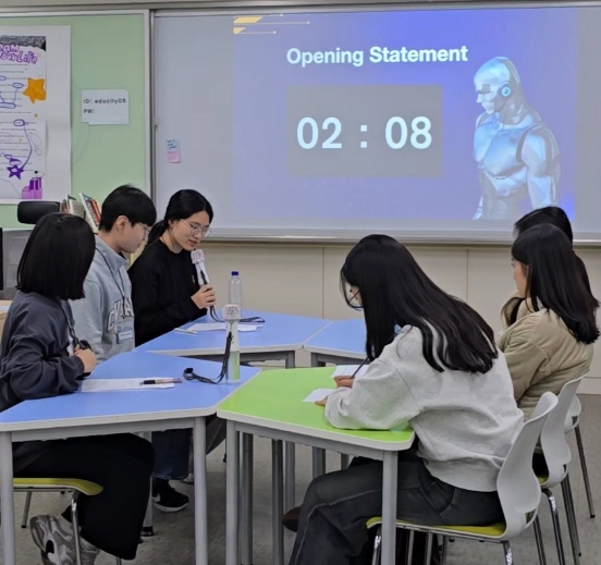 ![]() 학생들이 인공지능(AI) 윤리를 주제로 영어 토론을 진행하고 있다. |